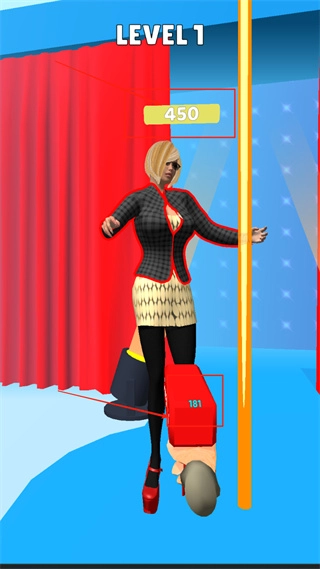 3、操作金发戴墨镜的女性角色踩踏红色卡通人头,留意上方显示的450分数以及脚下的181数字,背景装饰有红色幕布和黄色杆子。