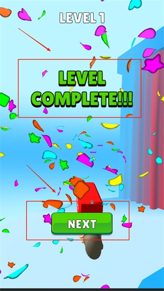4、当关卡完成后,画面会出现“LEVEL COMPLETE”字样以及彩色纸屑。此时,点击绿色的“NEXT”按钮,即可进入下一关。同时,背景能看到红蓝幕布,还有棕色角色的部分身体。