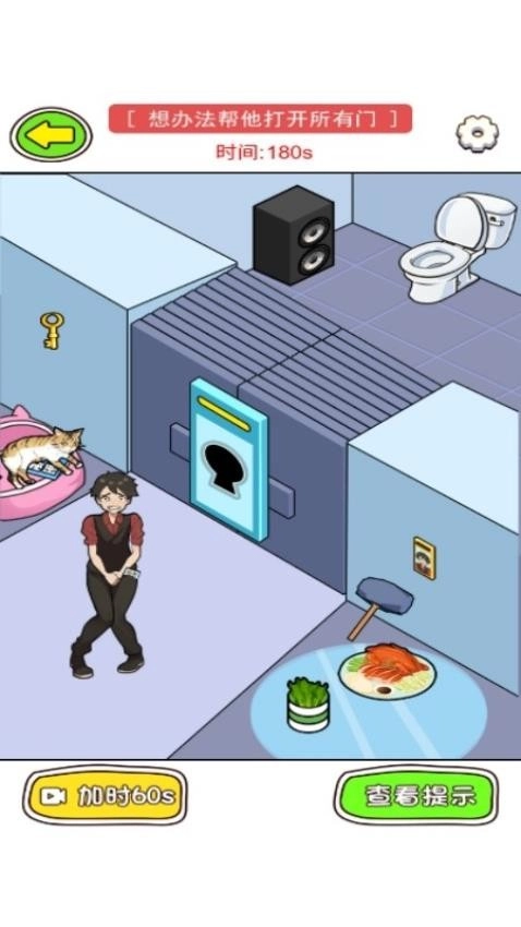 2、游戏任务:想办法帮他打开所有门,时间:180s,在游戏画面找到钥匙,将钥匙打开全部门就可以完成当前的关卡