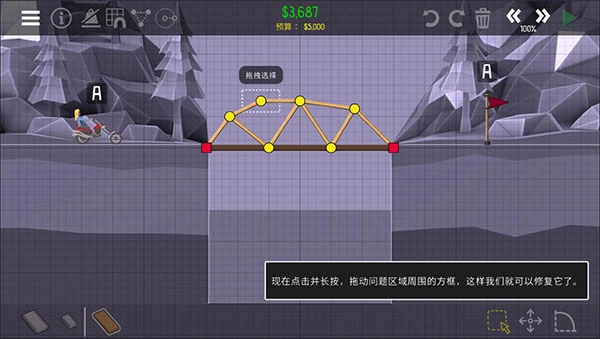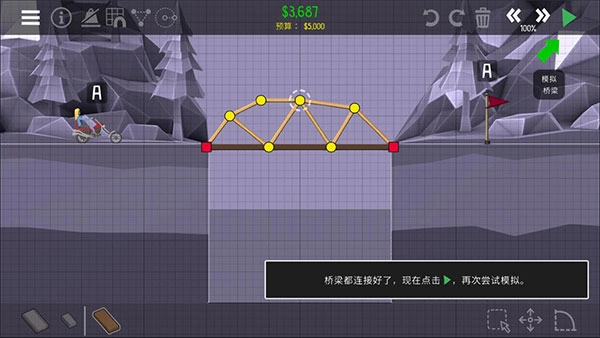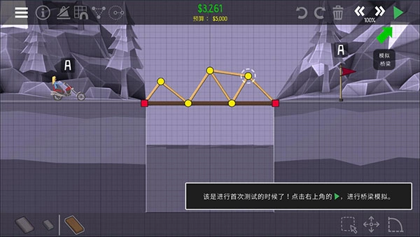 4、该是进行首次测试的时候了!点击右上角的绿色播放按钮,进行桥梁模拟。