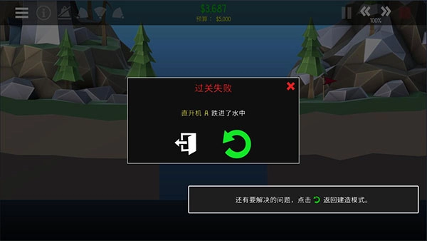 8、很遗憾,依旧过关失败,直升机A一头栽进了水里。若想再次尝试,还有待处理的事项,只需点击绿色的返回按钮,就能重新回到建造模式。