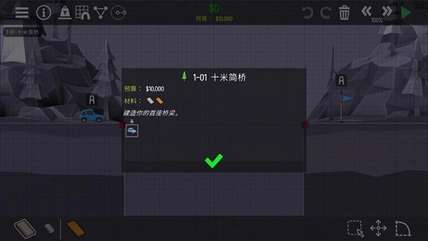 1. 欢迎踏入《桥梁建造师2》的世界!让我们一同搭建一座桥梁,征服眼前这条鸿沟!第一步,请点击左下角的材料种类,开启材料选择之旅。