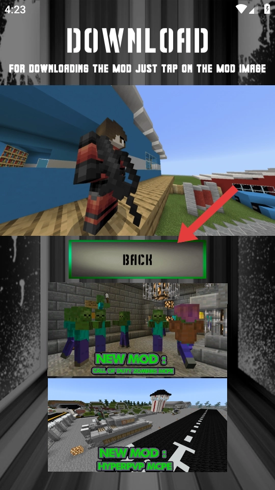 3、要是想更换模组,回到下载页面点击“BACK”进行切换,接着重复选图和加载的步骤,试着通过使用不同的MOD来丰富你的我的世界体验。