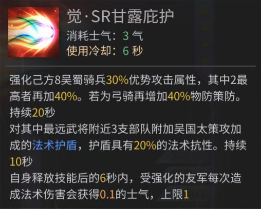 主动技能虽然3气,但是觉醒后的效果可以回复最高1的士气,而这个体系的法术伤害频率并不低,6s内打出10次法术伤害是很容易的事情。相当于一个2气的技能,却带来了极高的buff收益,其中陆逊周瑜各自有70%的提升,其余人则是30%,并且法骑部队额外获得40%的双防,以及有着20%法术抗性的护盾,面对一些群攻或者远程的消耗式的法术攻击时(例如鬼谋郭嘉,鬼谋蔡文姬等)能抵消掉可观量的伤害。