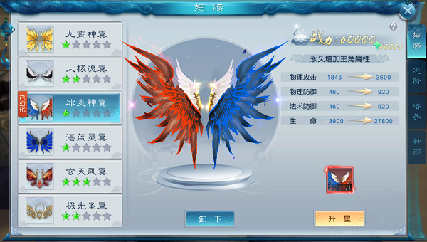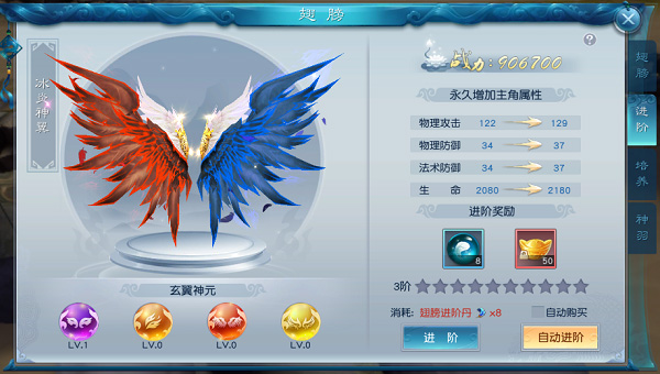 2、可消耗翅膀进阶丹对所佩戴的翅膀进行升阶,升阶可永久性提升主角属性。