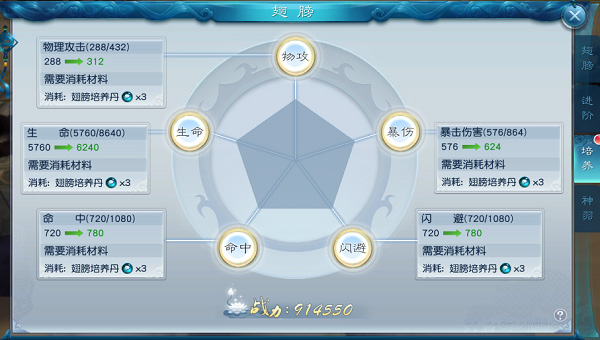 在翅膀主界面,点击右侧边框里的培养选项,就能进入翅膀培养界面。
