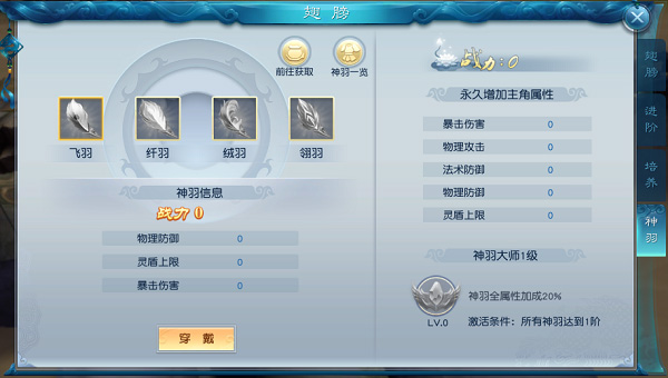 2、当所佩戴的神羽达到一定阶数时,有额外的属性加成(以最低阶的神羽为标准)。