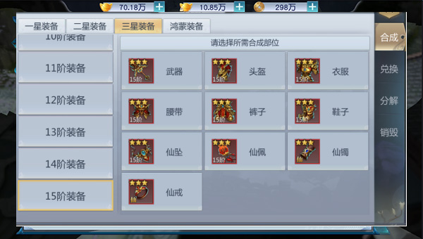 三个相同部位的红色2星装备消耗一定数量的三级淬炼星石可合成为3星红色装备。