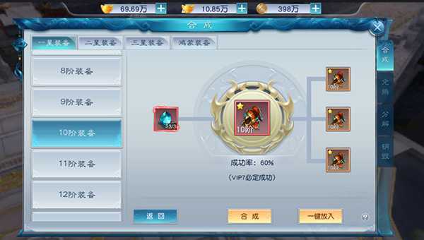普通橙色1星装备可通过合成升为极品红色三星装备,其中三个相同部位的橙色1星装备消耗一定数量的一级淬炼星石可合成为1星红色装备;