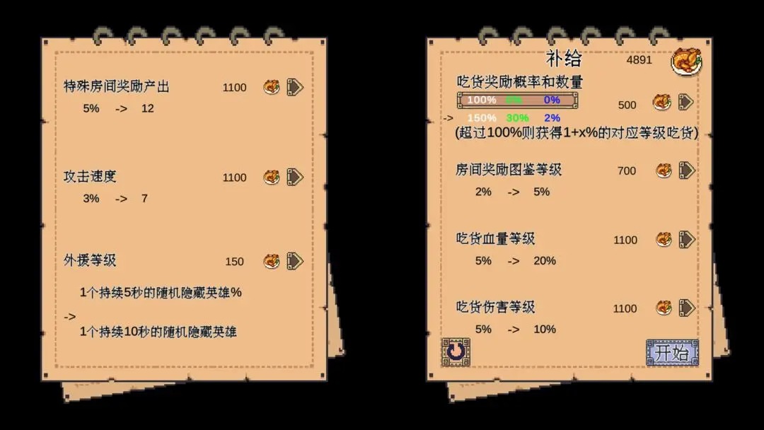 在每一大关开始前,可以使用鸡腿增强全体英雄的基础属性,这个加点是永久的~推荐优先点满右上角的「吃货奖励概率和数量」,这条属性能大幅提升每关卡结束后三选一英雄的数量和基础品质!
