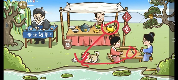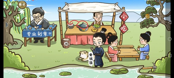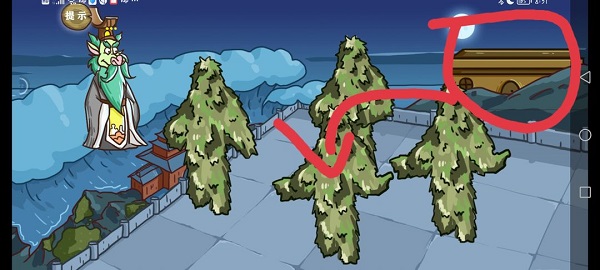 第三步:点击刻章的老头,等他说完话后再点一次,这时会出现金色的章,接着把树上的松果拖到章上面。