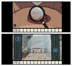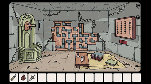 10、走上二楼过道,按照暗影逃脱中的图示输入符号,打开红色盒子,获取「玻璃杯」。接着前往之前激活喷泉的房间,用玻璃杯装满水,喂给守卫。待守卫石化并风化后,拿走掉落的「断剑」,再用皮包盛一些地上的「沙子」。