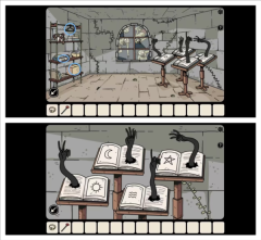 2、登上二楼,用钥匙打开绿色房间的门。进入房间后,在左侧的架子上能够找到「衣架」。接着,观察暗影逃脱右侧的书架,注意手指顺序所对应的符号「水·日·星·月」。