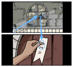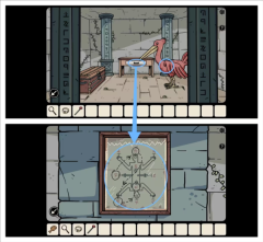 12、输入符号密码打开房间左侧的箱子获得「火柴」以及「提示纸」,再到棕色房间结合提示纸花纹的位置正确摆放鸟蛋(如上图)获得「剑尖」,接着到蓝色蓝色房间用火柴点燃壁炉里的木头,组合断剑和剑尖再放入壁炉进行修复。