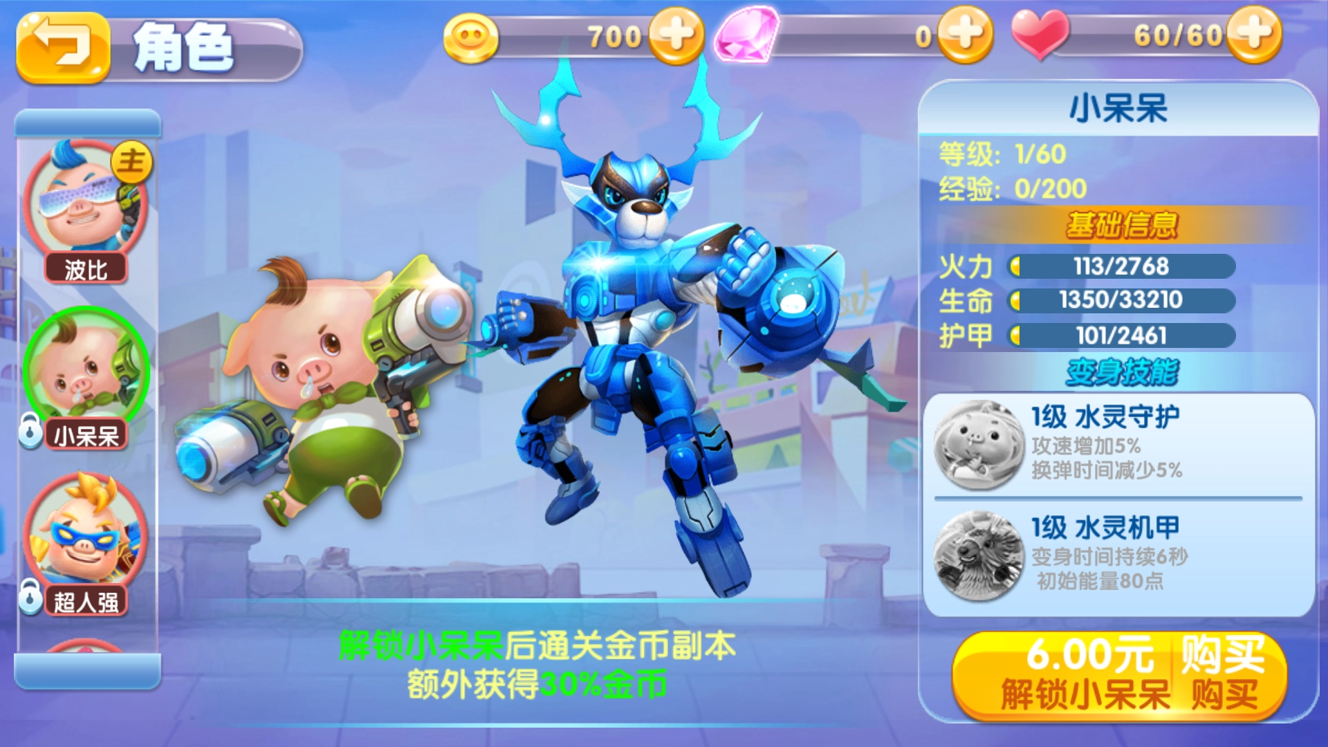 2、小呆呆:解锁小呆呆后通关金币副本额外获得30%金币。可变身水灵机甲。