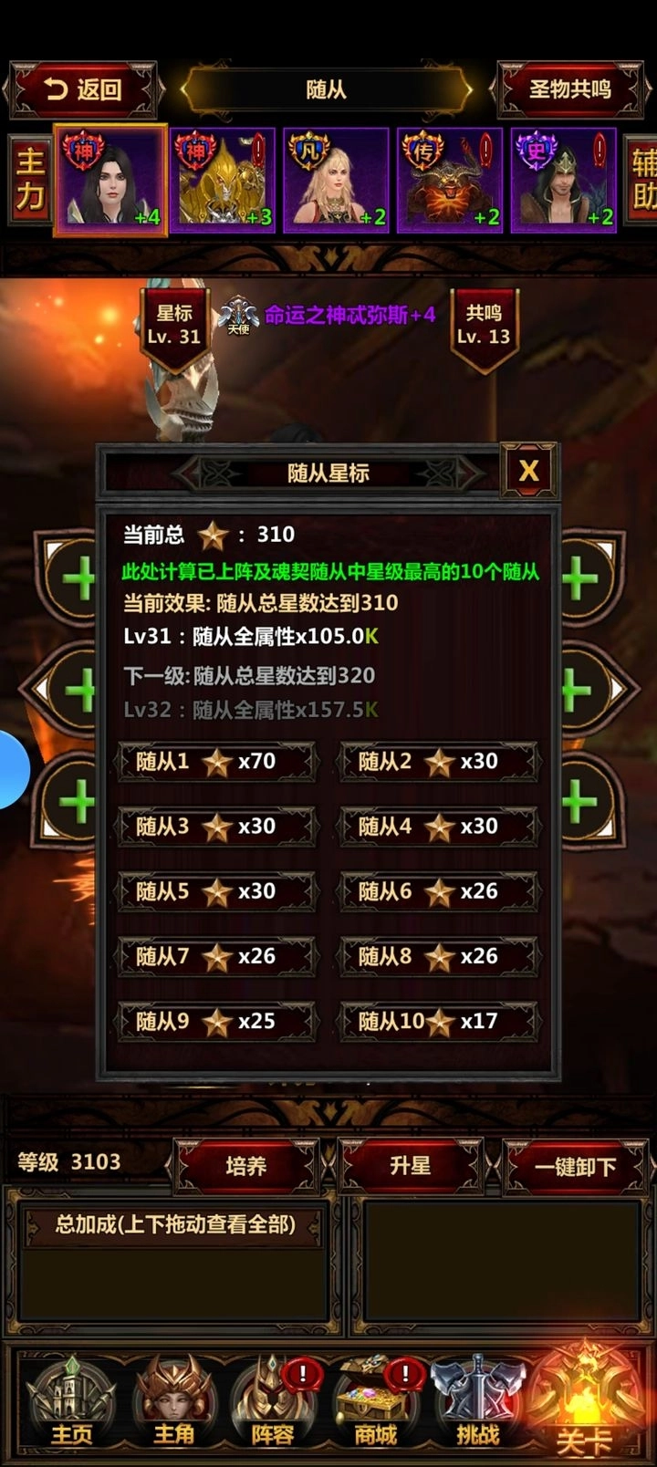 在前期推进关卡的阶段,要优先给一个主要随从提升星级;当给这个主随从升一级所需的资源,比给其他随从升5星的资源还多时,就优先把星标等级提高一级。