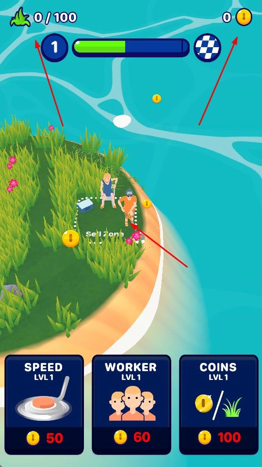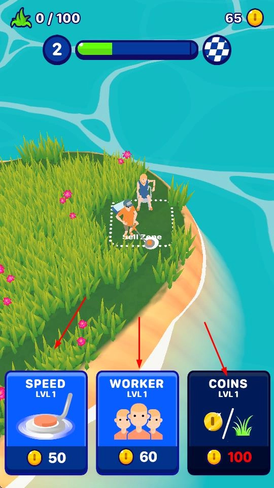 2、移动时,把收集到的草丛运到SELLZONE区域卖掉,就能获得金币奖励,另外还要留意上方的关卡信息和金币数量。