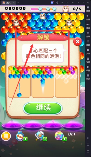 1、玩家滑动屏幕就能控制泡泡的发射方向,只要让三个或以上相同颜色的泡泡连在一起,就能完成消除并得到对应分数,整个操作简单,很容易学会。