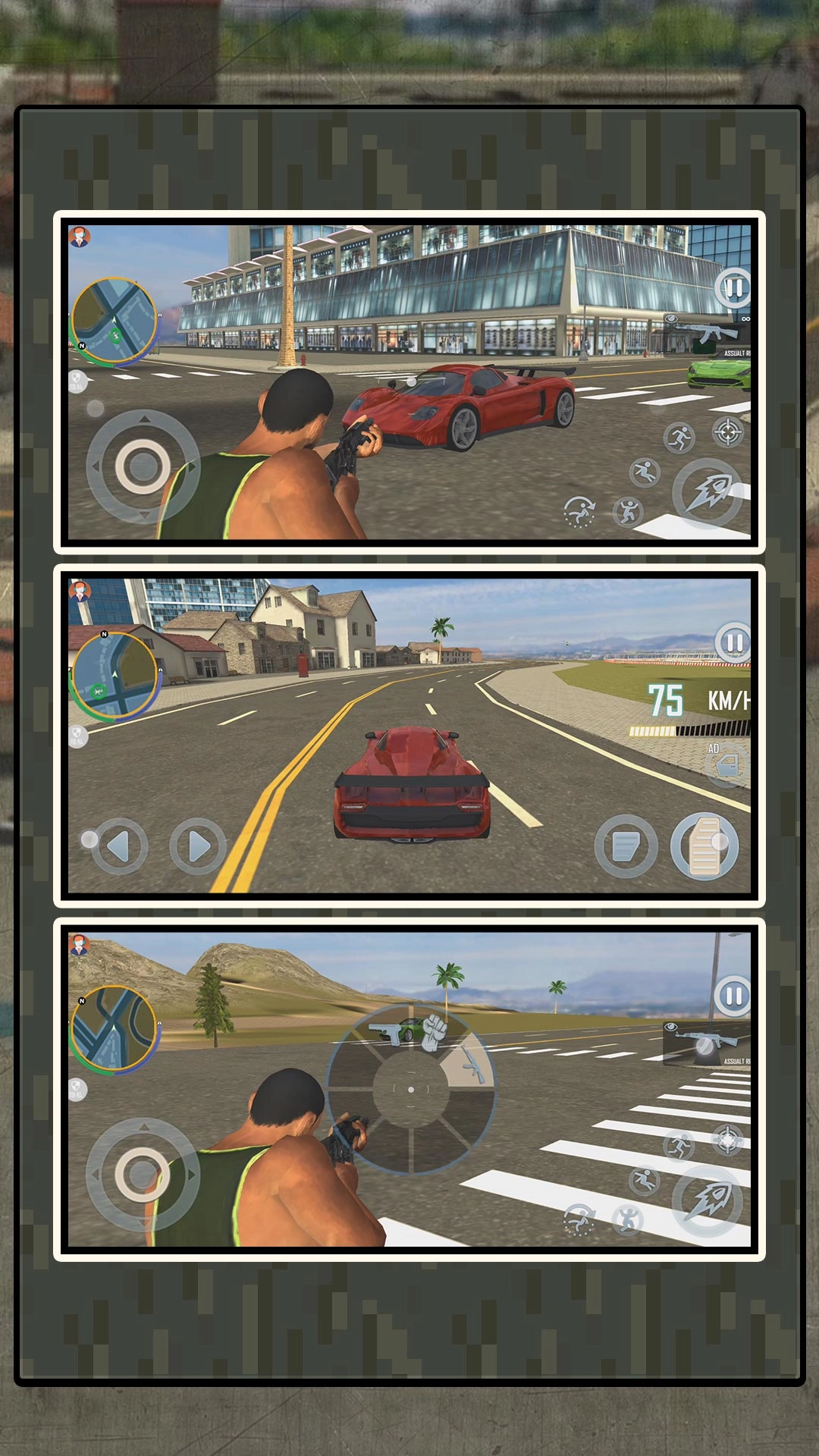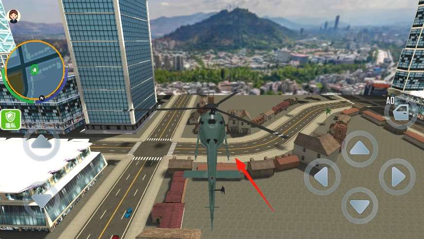 进入游戏显示界面后,能看到城市街道、房屋、建筑以及直升机,视角为高空俯瞰;通过操作左侧的按钮,可控制行走方向。