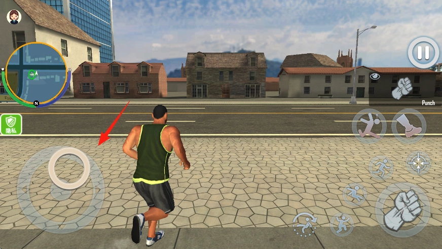 2、如图所示,图中的男性角色身着绿色背心与黑色短裤;界面上设有移动摇杆,以及拳击、踢腿等动作按钮;玩家能够操控角色在城市里自由移动、进行互动。