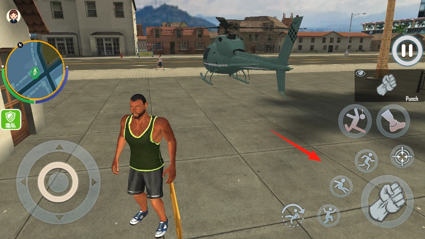 3、角色能够拾取武器,还可以驾驶直升机在空中飞行,直升机左右两侧设有对应的操作按钮,用于控制飞行。