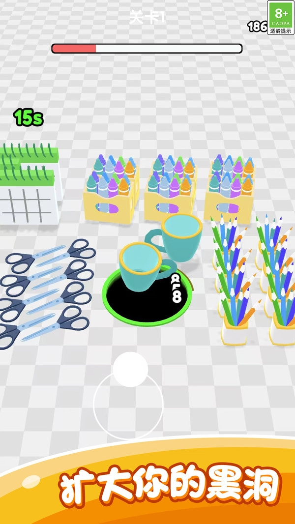 1、操控黑洞在关卡场景内移动,靠近各种物品时,黑洞会自动将其吞噬。