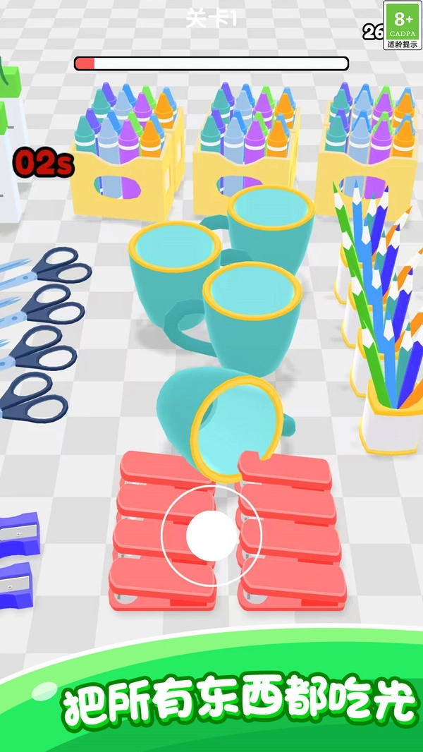 4、相关的各类物品会以不同布局呈现在场景里,你得尽快确认它们的位置,制定出合理的吞噬方案。