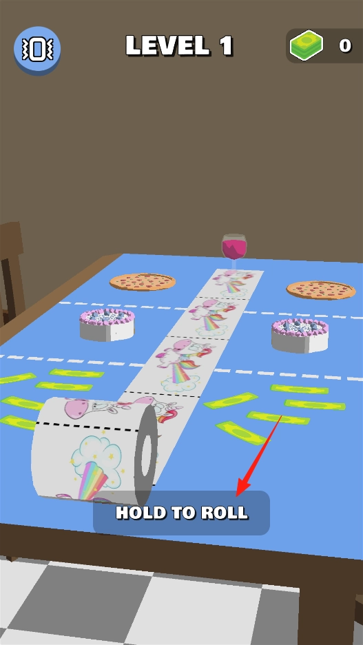 1、进入卷卷美元的第一关后,按照“HOLD TO ROLL”的提示,长按屏幕来让印花纸卷滚动;通过持续长按的操作,能让纸卷在桌面上向前移动,铺展覆盖经过的路径,同时收集沿途的绿色钞票,以此熟悉并体验纸卷的滚动铺展机制。