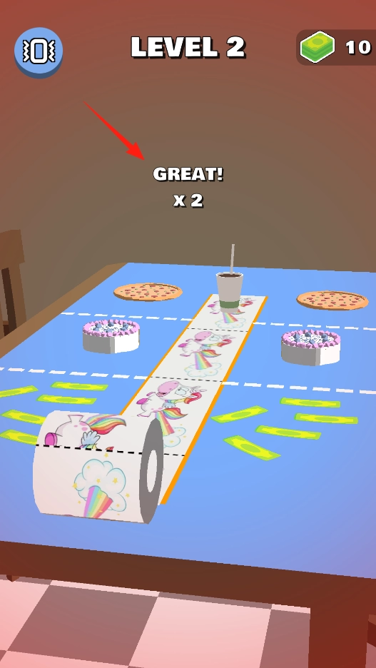 3、开启第二关后,继续控制纸卷滚动以覆盖桌面上的区域。滚动过程中若触发“GREAT×2”提示,说明操作表现出色,此时能收集到更多钞票。借助连击机制可进一步提高游戏得分,尽情感受进阶关卡的挑战乐趣。