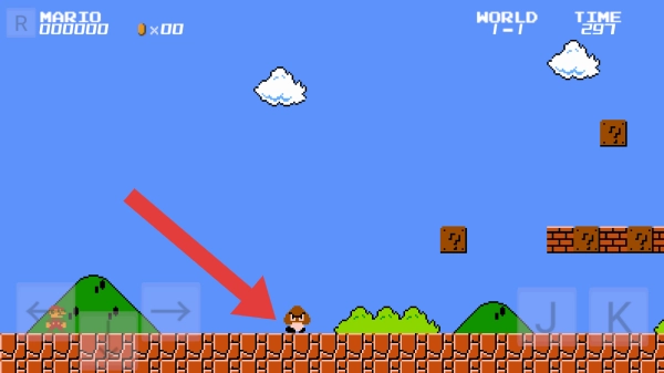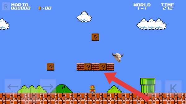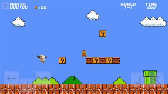 2、场景元素:砖块、问号方块、云朵、山丘、操作按键←、→、J、K,是经典的马里奥闯关关卡场景。