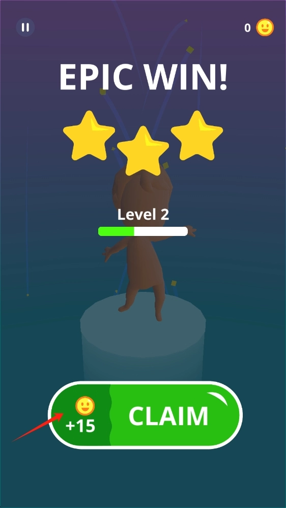 3、游戏胜利界面会有箭头提示,按照提示点击CLAIM按钮领取奖励后,即可继续挑战下一关,探索更多游戏内容,推动游戏进度向前。