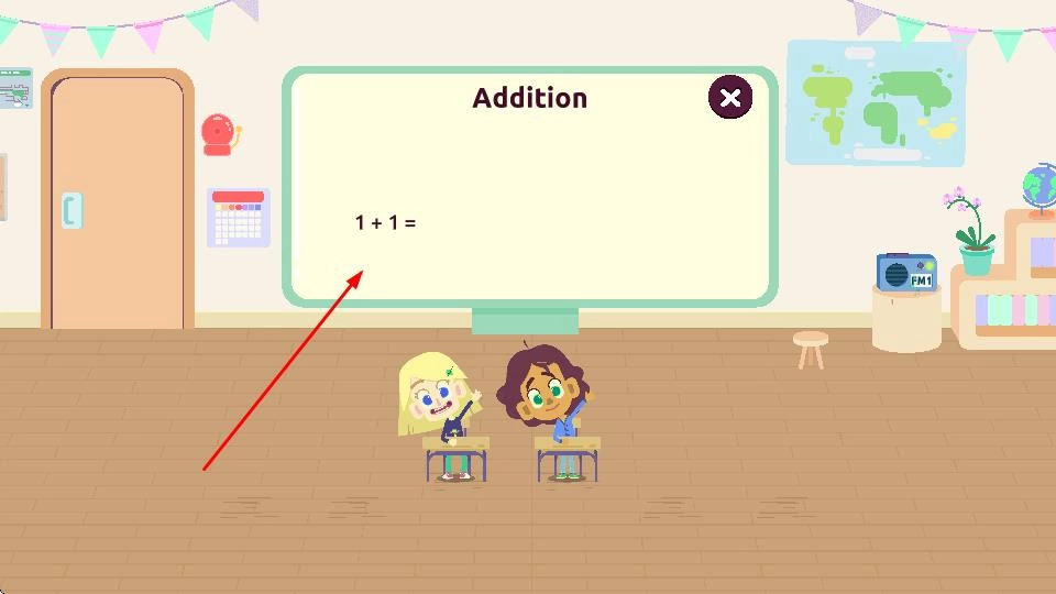 3、当黑板上出现数学题如基础加法1+1=,每成功解出一题,就能推进游戏进程,解锁新的学习挑战,在趣味互动中提升数学能力。