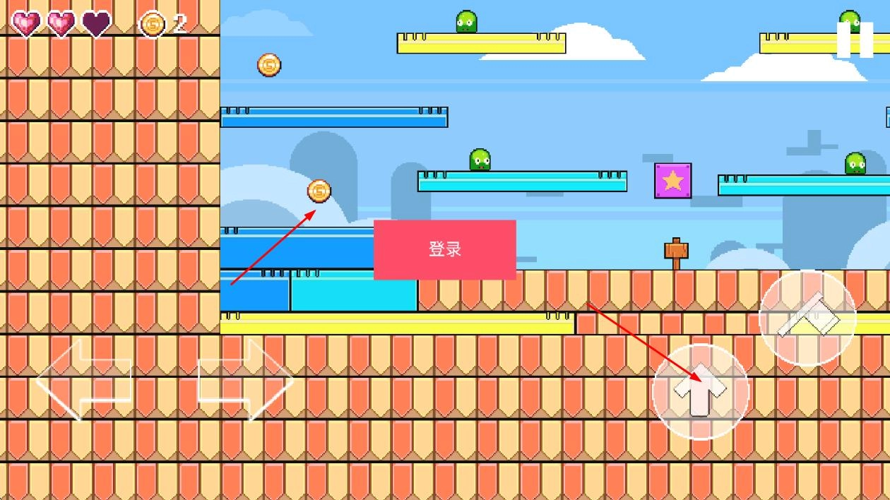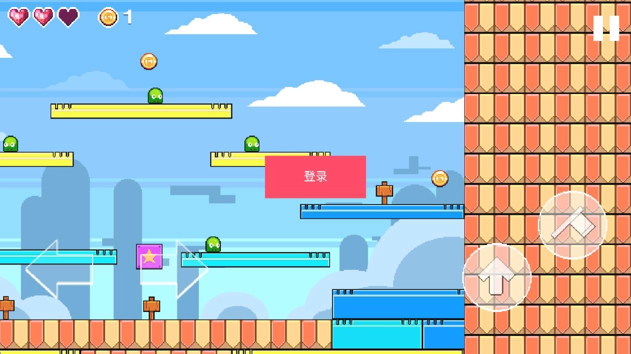 进入游戏后,借助屏幕上的四个虚拟按键操控绿帽王,通过左右移动与跳跃键来规避怪物和陷阱,开启这场冒险之旅。