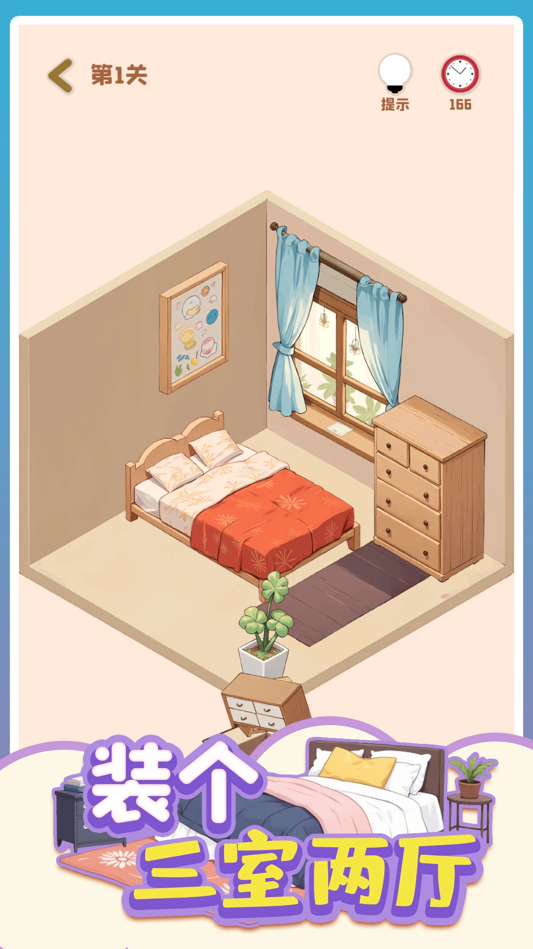 这是一款装扮房间的休闲游戏,游戏中需要玩家把打包好的家具放到房间中,装扮自己的小屋,精心收纳客厅和卧室,快来挑战一下吧。