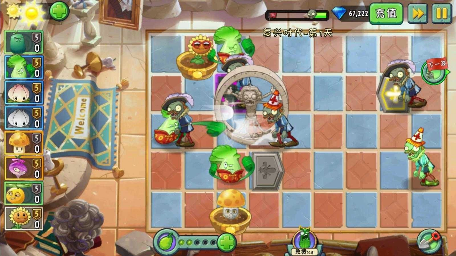 进入游戏后,首先在3个连环瓷砖上种植生产阳光和金币的带装扮原始向日葵。种好2排向日葵,就可以源源不断地生产阳光了。当然如果你的植物阶数不高,种向日葵的同时最好种一些攻击型植物,防止僵尸入侵。