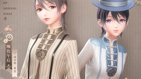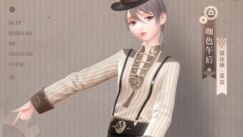 这款“咖色午后”是游戏中稀有的男装之一,倾向于中性风,非常独特。它的设计风格显然受英伦及欧式风格的影响,背带短裤与细条纹衬衫的组合,让穿上它的你仿佛成为一个可爱的“小正太”。