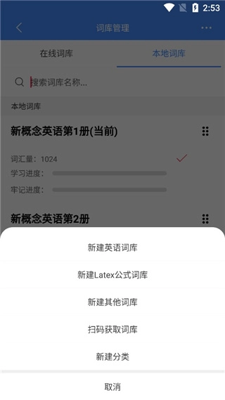 3、来到词库管理页面,这里设有在线词库与本地词库分类。同时,该页面支持依据语言、学段进行筛选,其中包含如英语的新概念系列、小学英语词汇等各类丰富词库,能够满足多样化的学习需求。