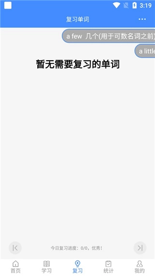 8、点击“复习”,便会出现你当天需要复习的单词。由于小编此次演示使用的是新账号,所以目前暂时没有需要复习的内容。