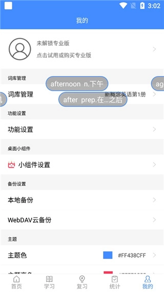 2. 在“我的”页面,你不仅能够执行词库管理、功能设置等操作,还可以解锁专业版、对桌面小组件以及备份方式进行设置,从而实现单词学习体验的个性化定制。