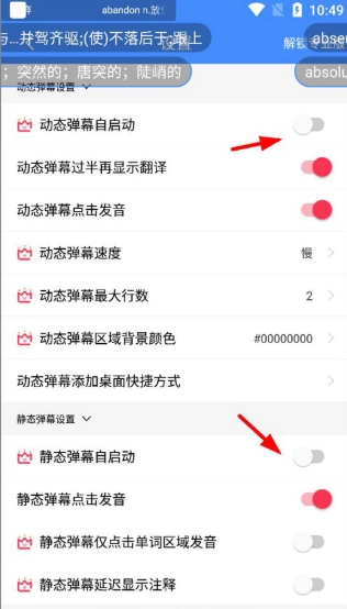 4、点击开启静态/动态弹幕,并下来打开悬浮权限设置即可在手机设置悬浮单词
