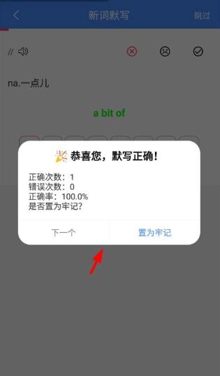 3、完成默写后,用户能够查看默写结果是否正确,既可以将单词标记为牢记,也能点击“下一个”继续进行默写。