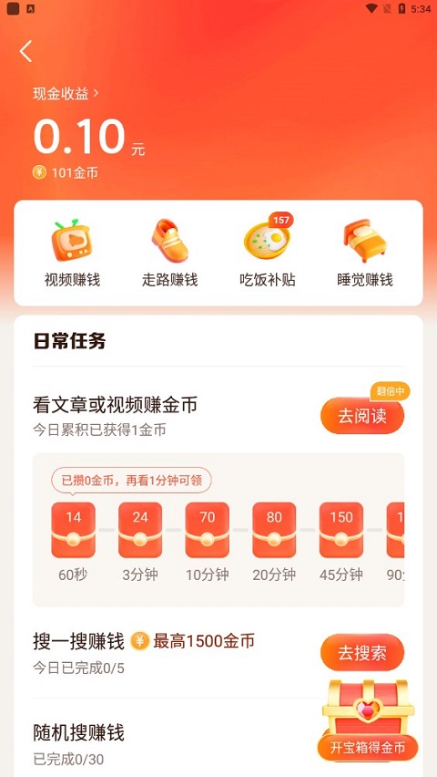 7、日常任务:每天都可以搜索赚钱,完成5次搜索获得1500金币;