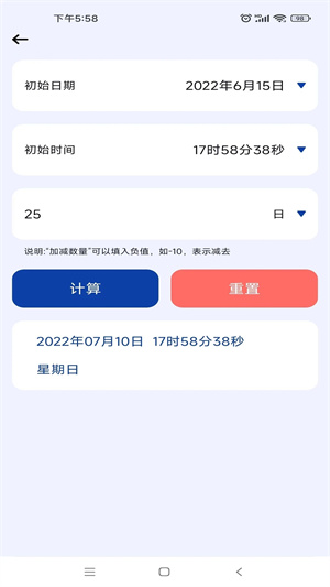 通过前后两个日期的选择,可精确推算这两个日期之间的天数、月数、周数,根据给定的一个日期,及一个或正或负的数字,推算距该日期一定天数的日期。