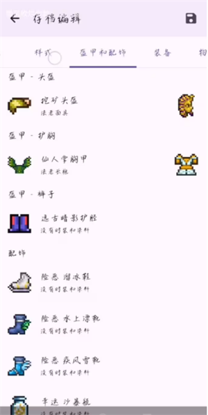 11、当进入盔甲与配饰界面后,便能对人物的盔甲、配饰以及鞋子等外观进行修改。