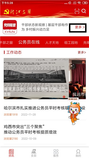 1、进入龙江先锋app,点击资讯页面上方的更多;