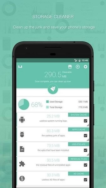 垃圾清理具备简洁且强大的垃圾清理功能,能够清理手机内部的各类垃圾,包括:系统垃圾、应用垃圾、无用安装包、卸载残留文件以及广告文件。