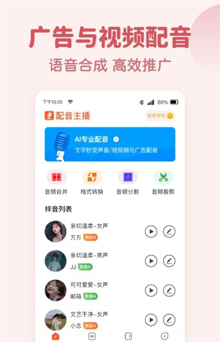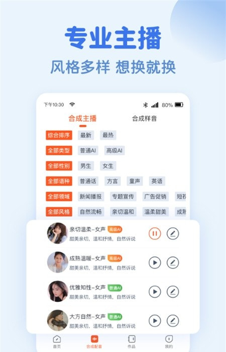 1. 专业配音功能:借助专业且强大的AI配音技术,只需一键操作,就能轻松实现专业配音效果。同时,提供海量主播音色供您随心挑选。