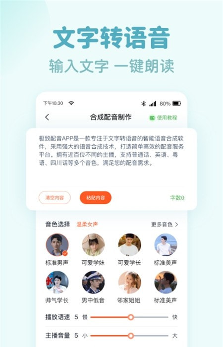 文字转语音趣配音是一款支持专业录音、在线翻译等多功能于一体的文字转语音配音软件!适用于商场店铺广告促销配音、地摊叫卖录音制作、英语听力音频制作、有声朗读等多种场景语音合成