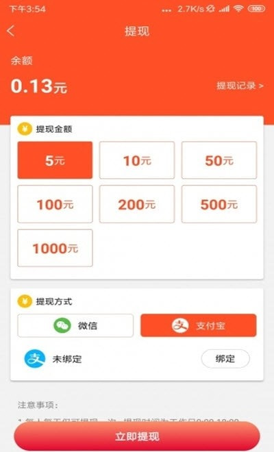 当收益达到5元及以上,即可提现至支付宝或微信。提现时间设定在工作日的9:00 - 18:00,且提现后一分钟内资金就能到账。
