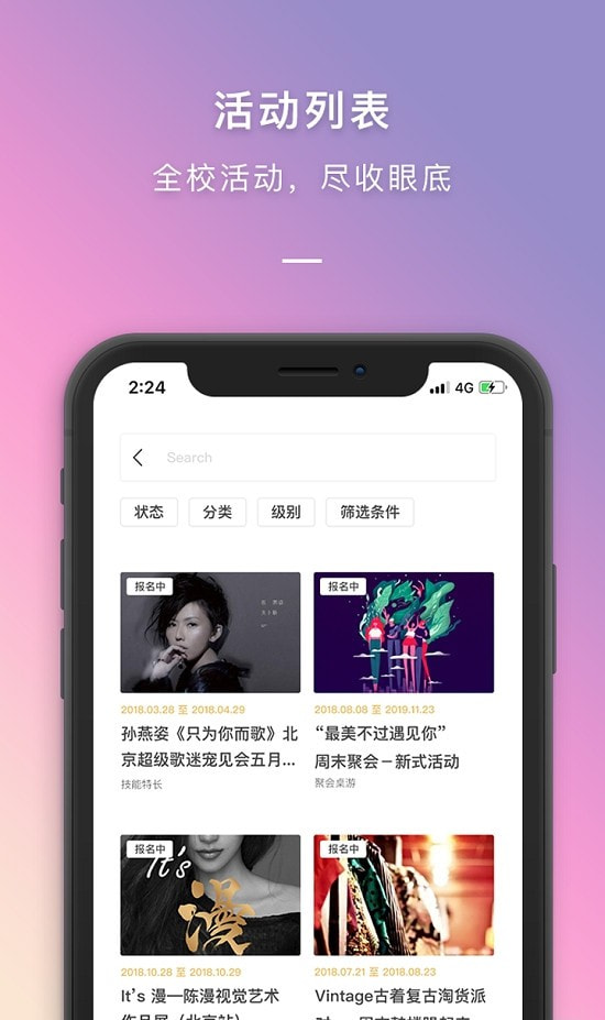 3、校园活动在线报名、打卡签到、颁奖、学分、评价;